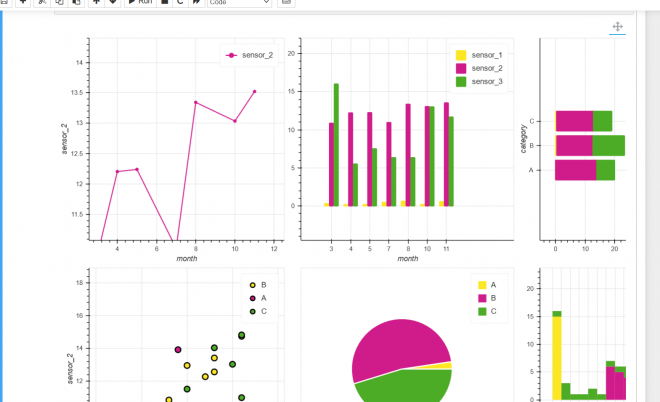 # Plot1 - Line plot p_line = df_random.groupby(['month']).mean().plot_bokeh(kind="line",y="sensor_2",color='#d01c8b',plot_data_points=True,show_figure=False) # Plot2- Barplot p_bar = df_random.groupby(['month']).mean().plot_bokeh(kind="bar",colormap=colors,show_figure=False) # Plot3- stacked bar chart df_sensor=df_random.drop(['month'],axis=1) p_stack=df_sensor.groupby(['category']).mean().plot_bokeh(kind='barh', stacked=True,colormap=colors,show_figure=False) #Plot4- Scatterplot p_scatter = df_random.plot_bokeh(kind="scatter", x="month", y="sensor_2",category="category",colormap=colors,show_figure=False) #Plot5- Pie chart p_pie= df_random.groupby(['category']).mean().plot_bokeh.pie(y='sensor_1',colormap=colors,show_figure=False) #Plot6- Histogram p_hist=df_sensor.plot_bokeh(kind='hist', histogram_type="stacked",bins=10,colormap=colors, show_figure=False)