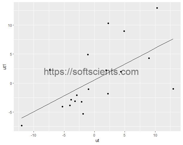 model2 = lm(data=produksi2, ut1~ut) ggplot() + geom_point(data = produksi2, aes(x=ut,y=ut1))+ geom_line(data = produksi2, aes(x=ut,y = model2$fitted.values))