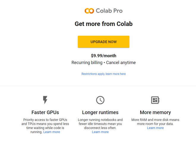 Layanan Cloud computing yang versi free yaitu google colab tanpa pro sudah cukup buat coba deep learning yang nggak berat-berat. Namun terkadang kita butuh lebih buat ngitung lebih cepat. Daripada beli sendiri GPU dengan harga 14 jutaan hanya dengan biaya $ 9.9/ 3 bulan akan lebih dari cukup untuk dicoba.