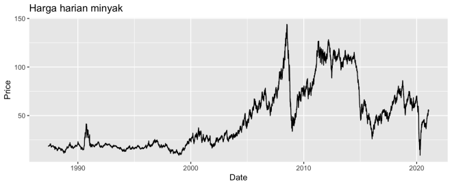 Koefisien d pada ARIMA digunakan untuk differencing data jika data tersebut tidak stasioner. Yuk kita lihat data harga harian minyak yang bersifat non stasioner.