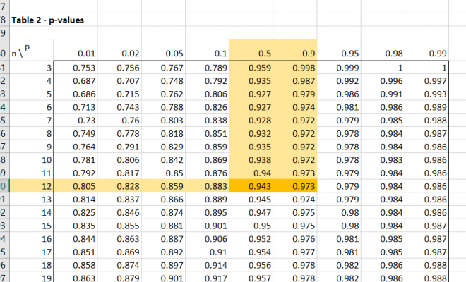 Sebagai contoh, anggaplah W = .975 dan n = 10. Berdasarkan Tabel 2 dari Tabel Shapiro-Wilk, nilai p untuk pengujian berada di antara .90 (W = .972) dan .95 (W = .978) .